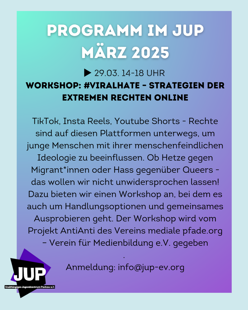 TikTok, Insta Reels, Youtube Shorts - Rechte sind auf diesen Plattformen unterwegs, um junge Menschen mit ihrer menschenfeindlichen Ideologie zu beeinflussen. Ob Hetze gegen Migrant*innen oder Hass gegenüber Queers - das wollen wir nicht unwidersprochen lassen! Dazu bieten wir einen Workshop an, bei dem es auch um Handlungsoptionen und gemeinsames Ausprobieren geht.